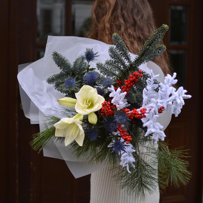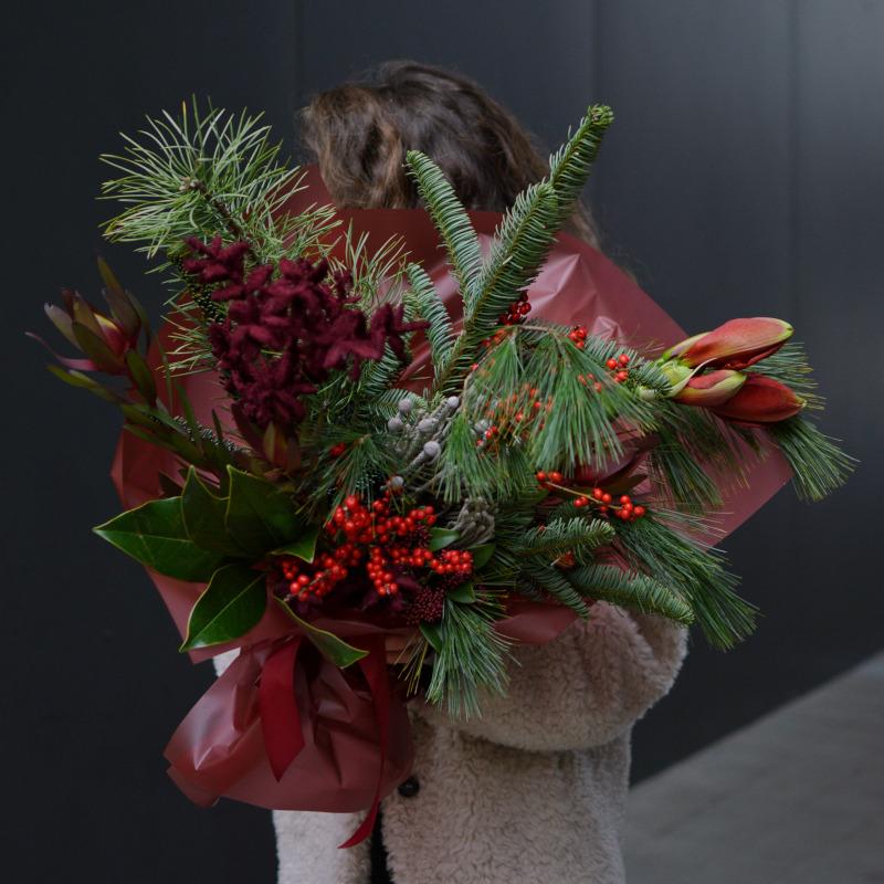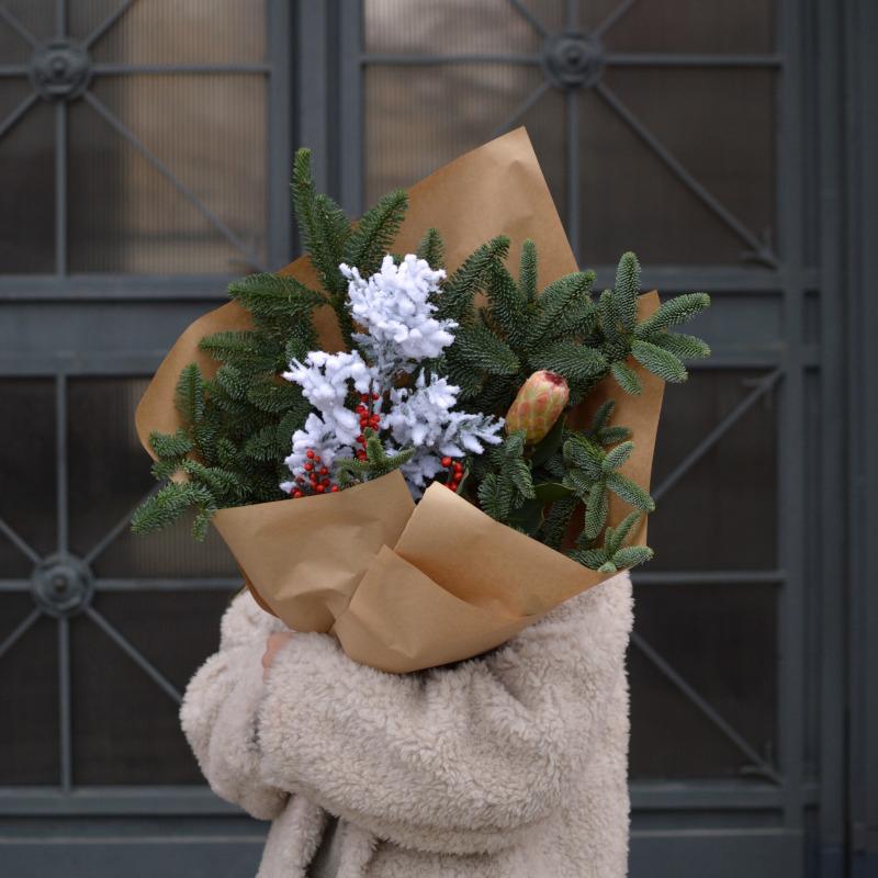 Task: record an aesthetic video (posted as reel) with flowers emphasizing how such an arrangement can help to create a Christmas / New Year mood. Can be also shown that such bouquets can be used as an attribute for 'pinterest' winter photo shoots.
